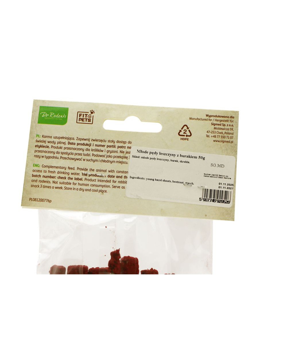 Mladé lískové výhonky jsou přírodní a aromatickou pochoutkou pro hlodavce a minaturní králíky, vytvořenou s ohledem na jejich zdraví. Kombinace pečlivě sušených lískových výhonků se sušenou červenou řepou vytváří chutnou a výživnou svačinku.