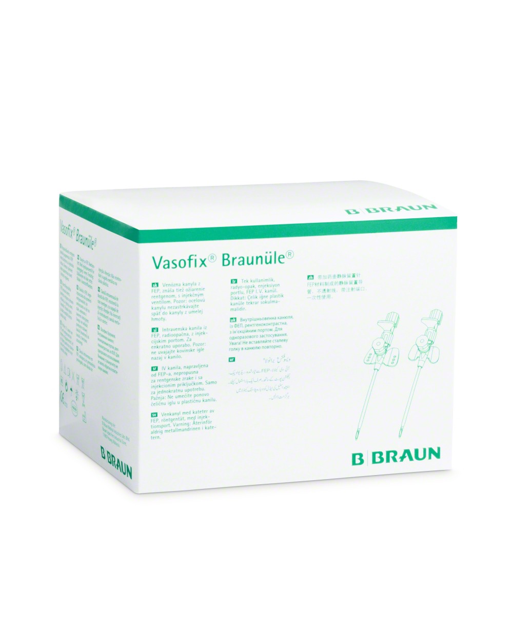 Intravenózní katétr, kanyla Vasofix Braunüle B.Braun, 50ks německé společnosti B. Braun mají speciálně formovanou koncovku vyhotovenou z teflonu, díky které k ní přizpůsobený tvar jehly má vliv na zmenšení otvoru po zavedení kanyly. Kromě toho použití speciální konstrukce kanyly (katétru) s tenkými stěnami dovoluje dosáhnout větší průtok. U kanyly byla použita zátka s hydrofóbním filtrem, která do značné míry brzdí vytékání krve. Použití elastických upevňovacích křidélek a současně zkoseného povrchu křidélek mají vliv na lepší stabilizaci kanyly (katétru) v cévě. Díky speciálnímu úchytu je možno provést punkci jednou rukou.